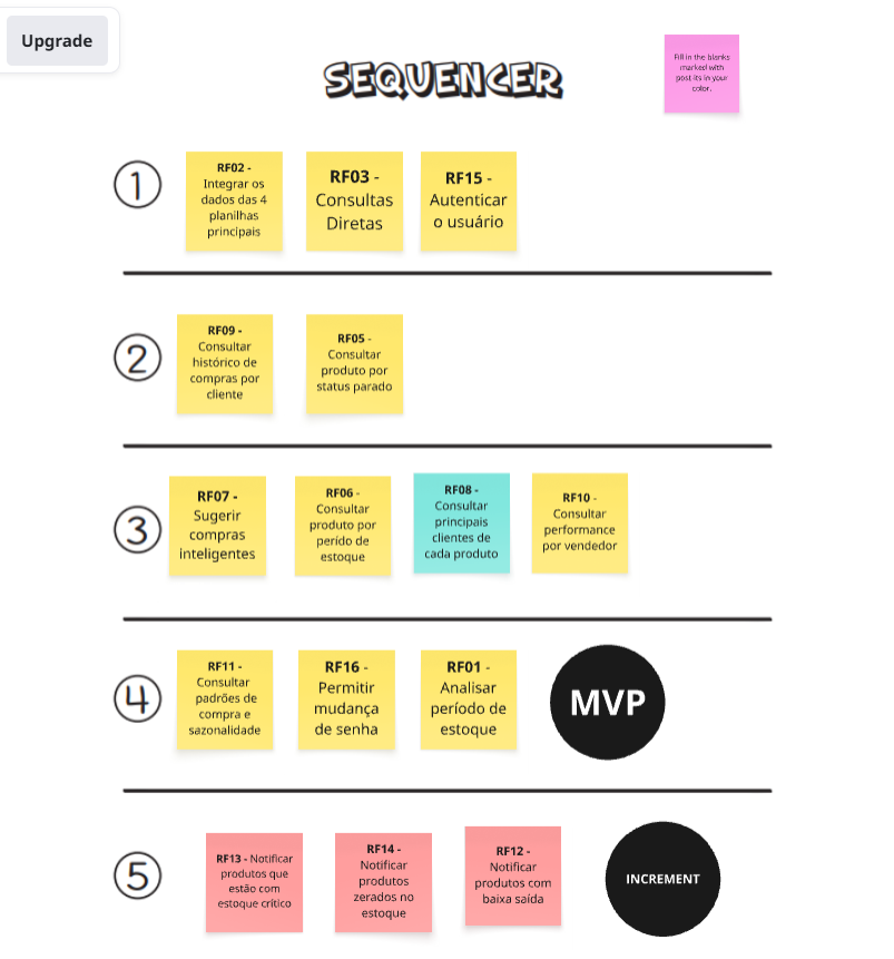 Para definir o escopo do MVP de forma estratégica, a equipe utilizou o sequenciador da metodologia Lean Inception. Essa parte do framework foi escolhida por permitir um alinhamento rápido entre a visão de negócio, as necessidades do usuário e a viabilidade técnica. O objetivo foi focar na construção do conjunto mínimo de funcionalidades que permite validar as principais hipóteses de valor do produto com o menor esforço possível, evitando o desperdício de recursos no desenvolvimento de itens não essenciais para a primeira versão.